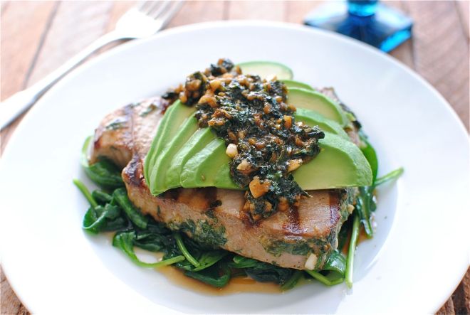 Tuna sellado, con salsa de culantro y aguacate, sobre cama de espinaca.