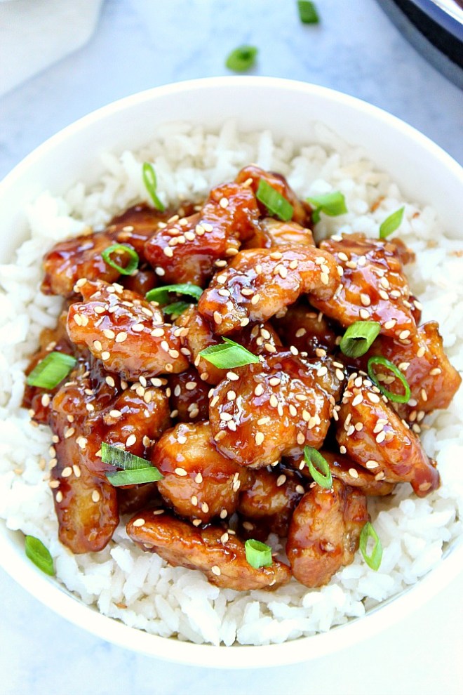 Pollo asiático, con salsa dulce a base de ajonjolí.